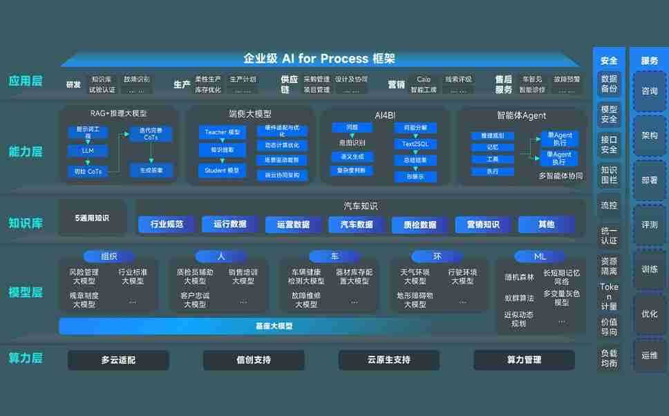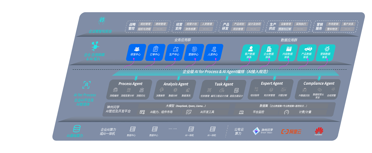 意昂2问学智车解决方案是一套基于AI技术的汽车行业智能化系统,,覆盖从底层算力到顶层AI应用的全栈方案。。方案由算力层、、、、模型层和应用层组成:算力层,,方案支持多种一体机配置,,,,具备云端灵活部署、、多云适配以及动态优化计算资源的能力;模型层,,意昂2问学平台版提供了企业级AI应用一站式构建与管理平台,,,支持基于后训练强化技术的汽车企业专属模型的训练、、评测和运营;应用层,,,意昂2问学DeepSeek版提供包括超级员工、、、智能招采、、、智能营销、、、、智能客服、、AI for BI等一系列解决方案,,,,可助力汽车行业实现数字化转型,,让管理更智能、、响应更敏捷。。。。
