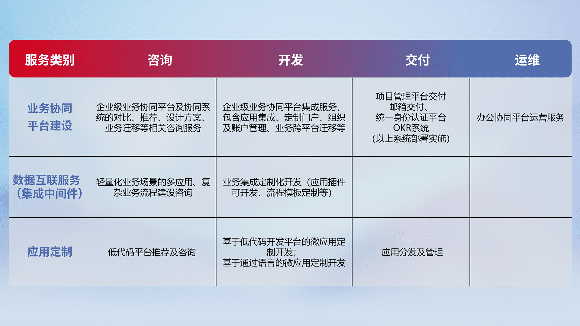 针对钉钉、、、企微、、IDaas等平台级产品提供产品的规划、、方案、、交付、、、、定制化开发等服务,,,,实现如统一协同办公、、智能客户服务、、、、混合会议管理、、、、智能数据查询、、等业务场景,,,,实现数字化转型。。。
