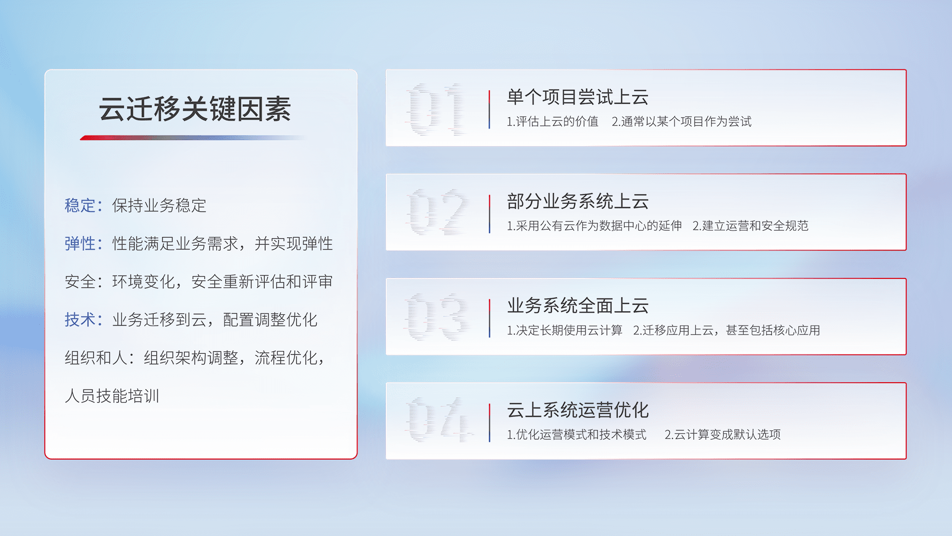 结合实际业务,,,从规划设计、、、、云平台选型、、、、云原生改造、、、数据迁移、、集成交付,,,迁移全过程为客户识别最佳上云路径,,,,做好风险识别管理,,,,设计网络架构、、、身份权限、、安全审计合规、、操作审计、、、、日志审计、、监控告警策略、、、、多站点容灾设计等,,,对云上基础设施进行整体规划,,提升IT治理水平,,以满足弹性、、、高可用、、、高性能的需求。。。。